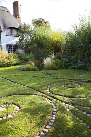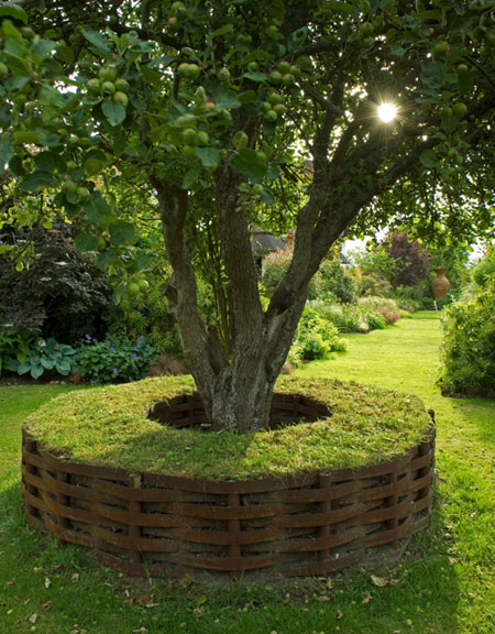 In 2009 we removed the last 5 poplars to the left of the Pavilion and created the 20m Celtic Racetrack (No.12 on the plan) in spring 2010. The Celtic racetrack as well as the metal tree seat are an ode to Dominic's beautiful mig welding skills (trading as Metallurgi) and my hair brain design!"