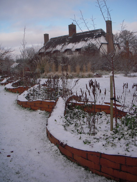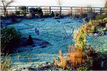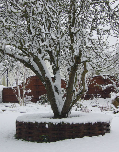 In October 2002 we planted the purple hazels and Tilly and I created the Stone Parterre while I was pregnant with Flori. The parterre here is shown in both summer and winter.