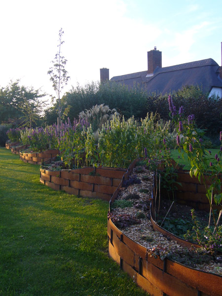 The Pavilion was completed in November 2003 and that winter I planted the curvaceous grass borders opposite and we put in the willow tunnel. The Copper Beech Spiral was mainly planted in November 2005. In March 2007 we put in the trampoline beds. There is always lots to do and lots to weed but its getting there!